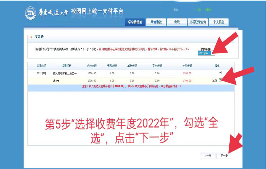 1.登录华东交通大学网站中的“统一支付平台”进行缴费。进入“华东交通大学网站”(http://www.ecjtu.jx.cn/),选择导航栏中的“校园服务”下的“统一支付平台http://zxjf.ecjtu.edu.cn/)”,登录“华东交通大学校园网上统一支付平台”(“用户名”为同学们的学号,“密码”为个人身份证号码后六位,新生第一次登录需提交手机号码,老生如手机号码有更改也需要重新提交。),登录成功后,选择“学杂费缴费”,选择“收费年度2022年”,填写“缴费金额”(如:本科1700元、专科1400……),确认无误后请按照提示完成缴费。