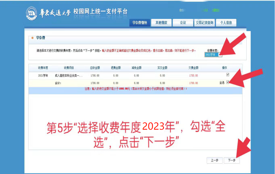 (一)账号登录:进入“华东交通大学网站”(http://www.ecjtu.jx.cn/),选择导航栏中的“校园服务”下的“统一支付平台http://zxjf.ecjtu.edu.cn/)”,登录“华东交通大学校园网上统一支付平台”(“用户名”为同学们的学号,“密码”为Hdjd@身份证号码后六位,新生第一次登录需填报手机号码,老生如手机号码有更改也需要重新填报),登录成功后,选择“学杂费缴费”,收费年度选择“2023年”,填写“缴费金额”(如:本科1700元、专科1400),确认无误后请按照提示完成缴费。
