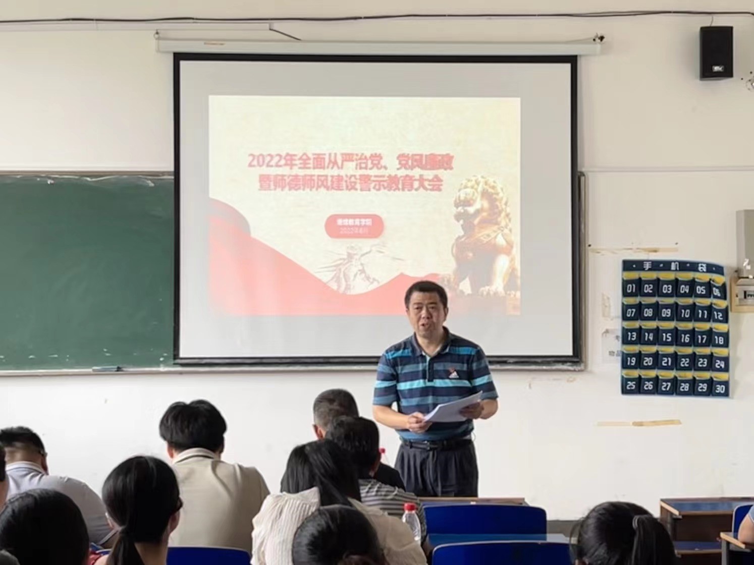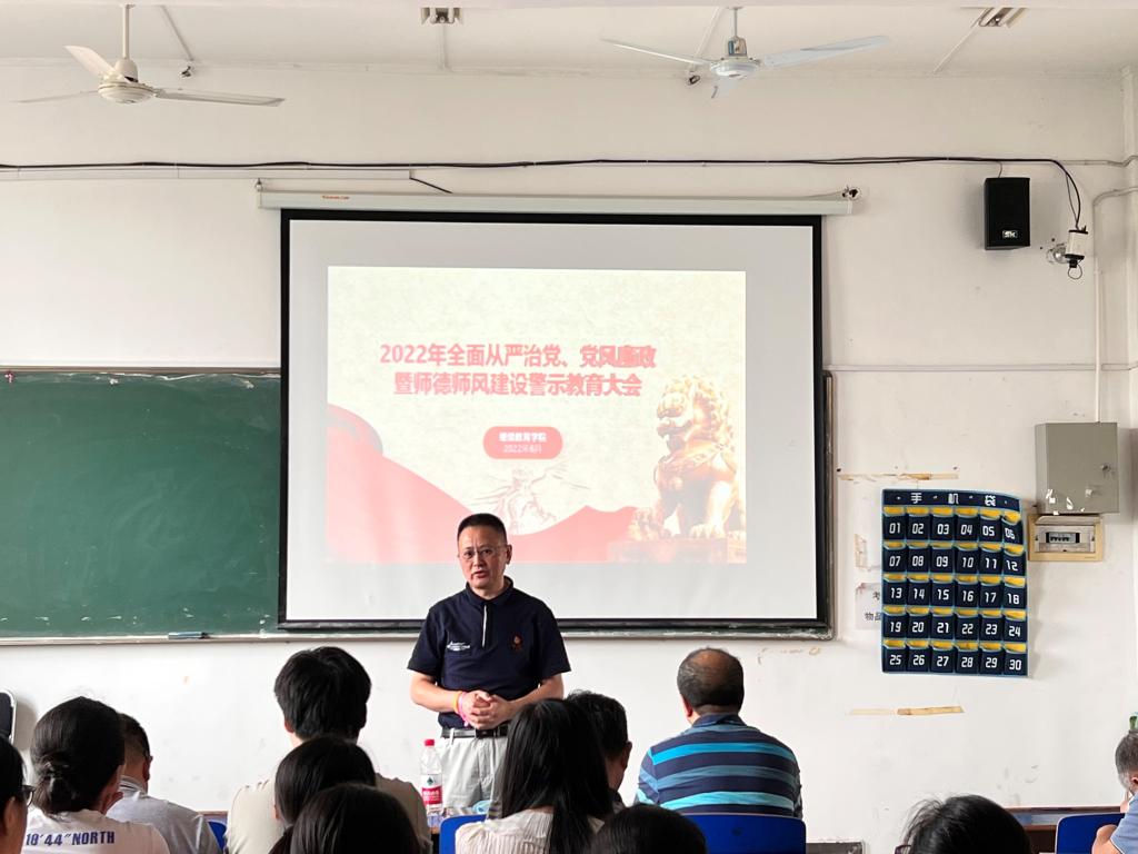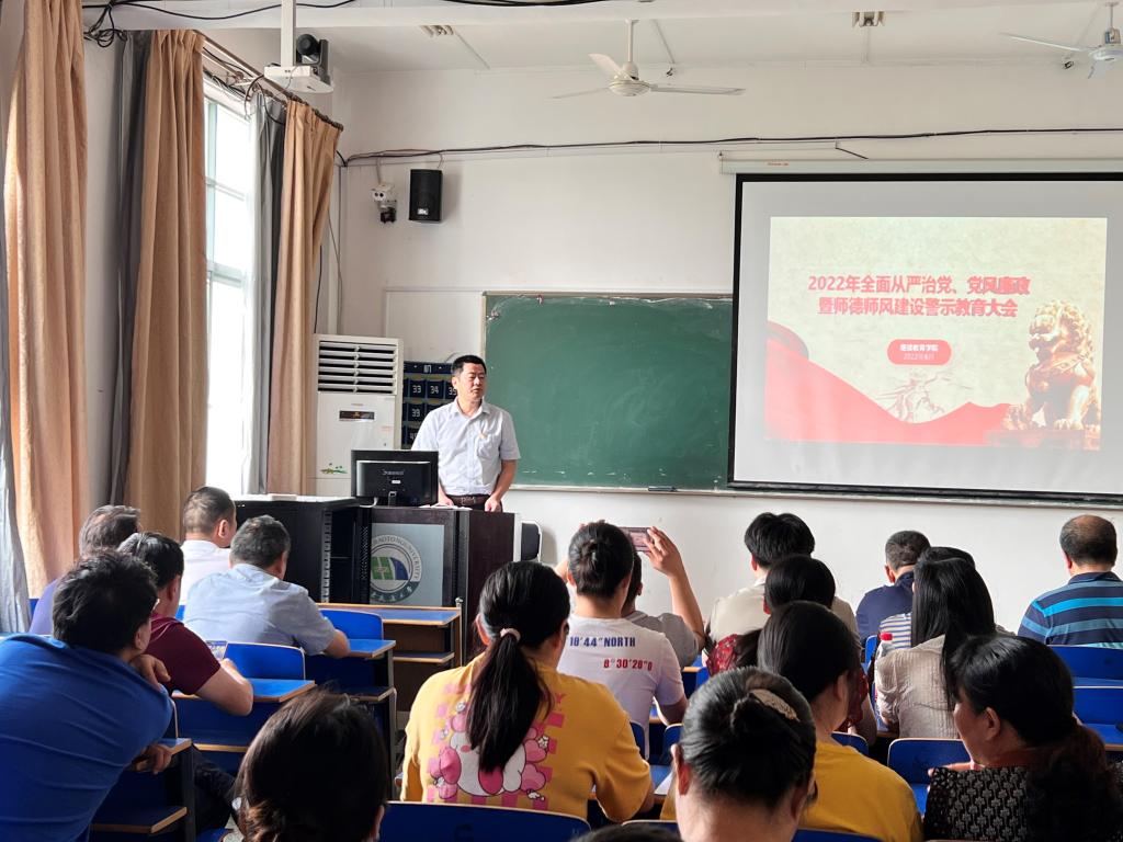继续教育学院党委于6月14日上午9点在教38栋404教室召开了2022年全面从严治党、党风廉政暨师德师风建设警示教育大会,院党委书记吴效葵主持会议。