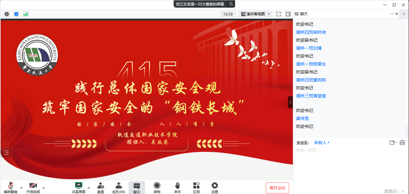 为做好学院思想政治教育工作,将政治领导与价值引领贯穿于学院工作的各个环节和过程,引导大学生树立正确的世界观、人生观和价值观,推动大学生对于国家政策有更加明确的认知,2022年12月17日,华东交通大学轨道交通职业技术学院党委书记吴效葵走进班级,以“践行总体国家安全观,筑牢国家安全的‘钢铁长城’”为主题,为2022级全体新生带来了一堂别开生面的思政课。