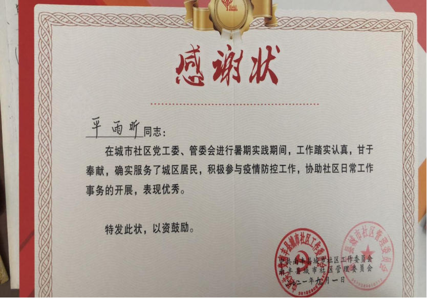 为响应国家社会实践的号召,2021年8月,我院19级工商管理班平雨昕同学主动报名参与南丰县解放路社区居委会组织的南丰县疫情防控青年志愿者活动,在城市社区党工委、管委会进行暑期实践期间,工作踏实认真,甘于奉献,确实服务了城区居民,积极参与疫情防控工作,协助社区日常工作事务的开展,表现优秀。有效地帮助居委会做了疫情防控、社区服务、日常事务等工作。获得了居委会工作人员的一致好评。