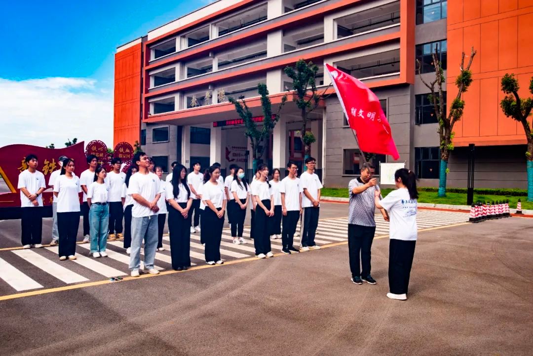 院党委书记吴效葵为2023年华东交通大学继续教育学院“火车头”大学生暑期社会实践队成员代表授旗。