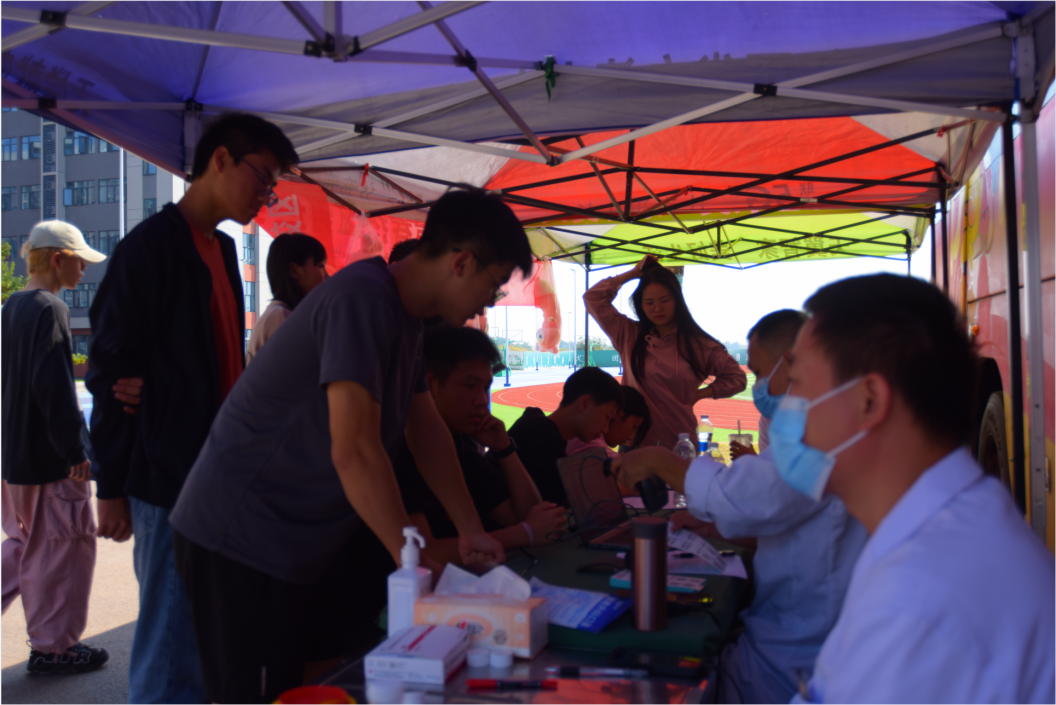 医护人员随着献血车来到献血点,志愿者积极准备帮助布置场地,献血者们早早在车前排队等候,在“红马甲”的引导下,献血者们填写好表格信息,排好队伍,整个献血过程井然有序;医护人员们为献血者们进行相关检查,以保障同学们的献血安全。同学们的真情凝聚成爱,点燃无数生命的希望。