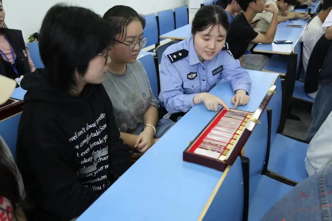 讲座中,禁毒大队的工作人员为同学们发放毒品仿真模型和禁毒宣传手册,并详细介绍了不同毒品的危害和禁毒相关法律法规。通过图片、文字和毒品仿真样品的展示,让同学们更直观地辨识毒品。同时结合一些真实事例,向同学们揭露罪犯下“毒”的惯用手段,希望能借此增强同学们的自我防范意识。