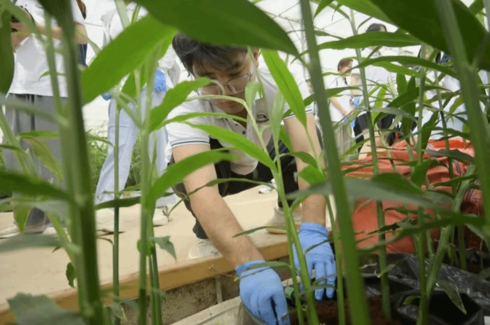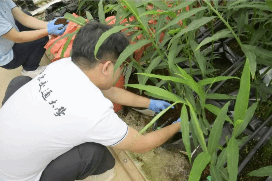 在进贤县农发智慧农业产业园,缅姜的种植首先是从选姜种开始的。技术人员会挑选出健康、无病虫害的姜种,进行切姜种处理,确保每块姜种都有足够的生长点和活力。经过处理的姜种会被放入育苗基质中进行育苗。无土栽培育苗基质为姜种提供了良好的生长环境,同时也减少了病虫害的发生。实践队成员在工作人员的帮助引导下,进行缅姜种植培育。