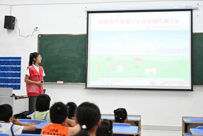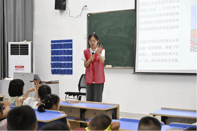 实践队队员陈晋首先引用了一段动画视频给孩子们展示党的发展历程,队员以历史时间轴的形式,带孩子们回忆党的百年光辉历史,激起孩子们学习党史的兴趣。讲解了何为党的二十大以及相关基础知识,让孩子们对中国共产党有一个简单清晰的认知。一个个挺直的腰板,每个人眼神中的坚定让我们看到了祖国光明的前途。今天的他们就是明天的未来!