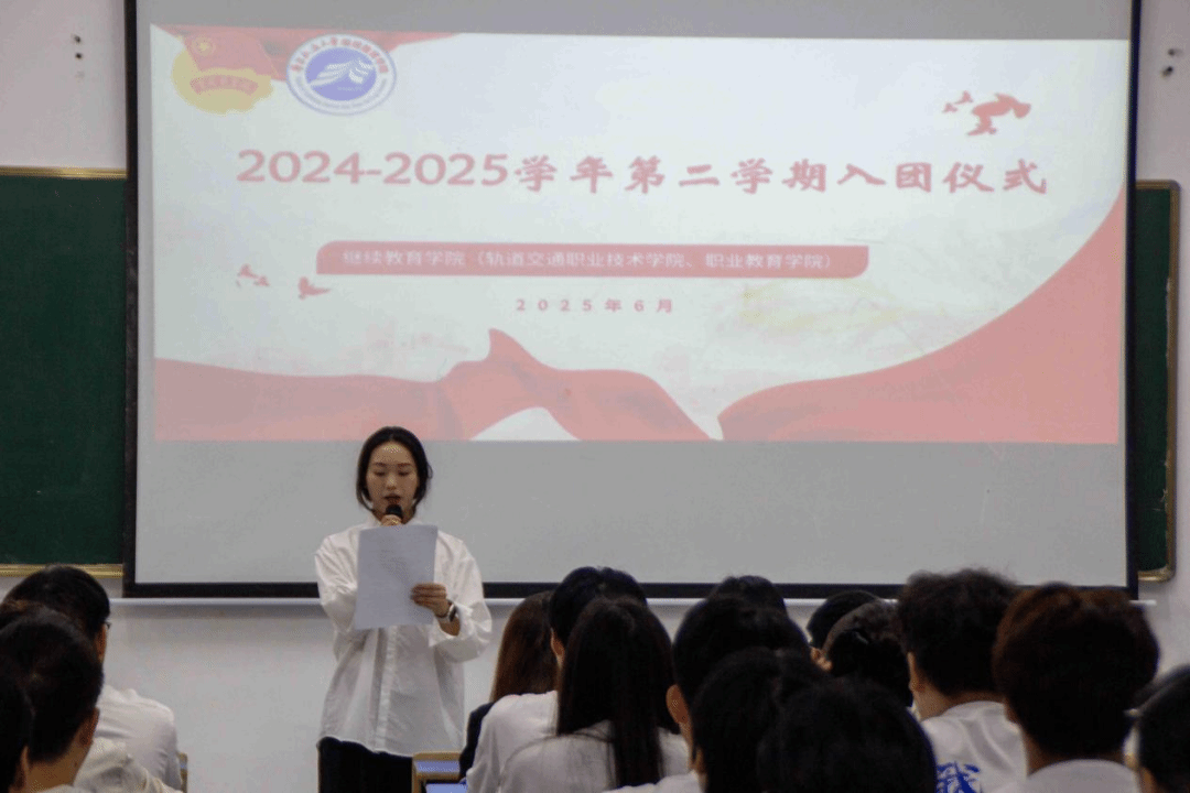 为深入贯彻落实习近平总书记关于青年工作的重要思想,进一步加强共青团员队伍建设,充分发挥共青团作为党的助手和后备军作用,6月11日中午,华东交通大学继续教育学院(轨道交通职业技术学院、职业教育学院)2024-2025学年第二学期新团员入团仪式在综合楼102隆重举行。院学工办主任兼团委书记汤烨老师、院学工办副主任兼团委副书记付凯丰老师出席活动,与全体新团员共同完成这场庄严的青春仪式教育,见证青年学子在团旗下的成长与蜕变。