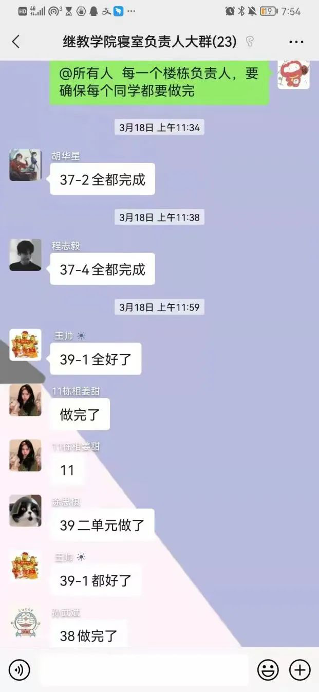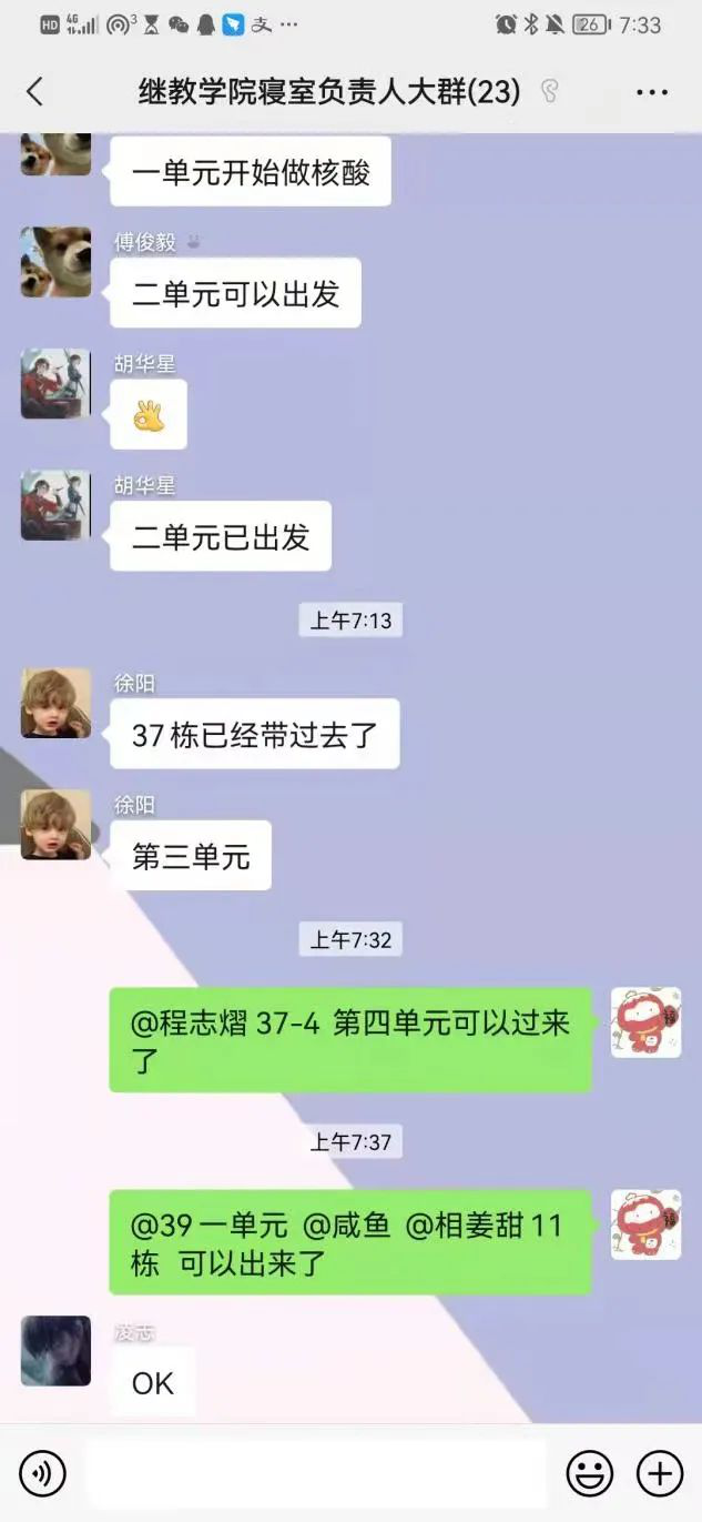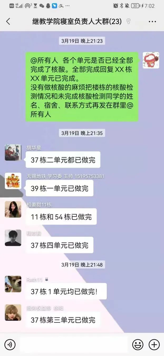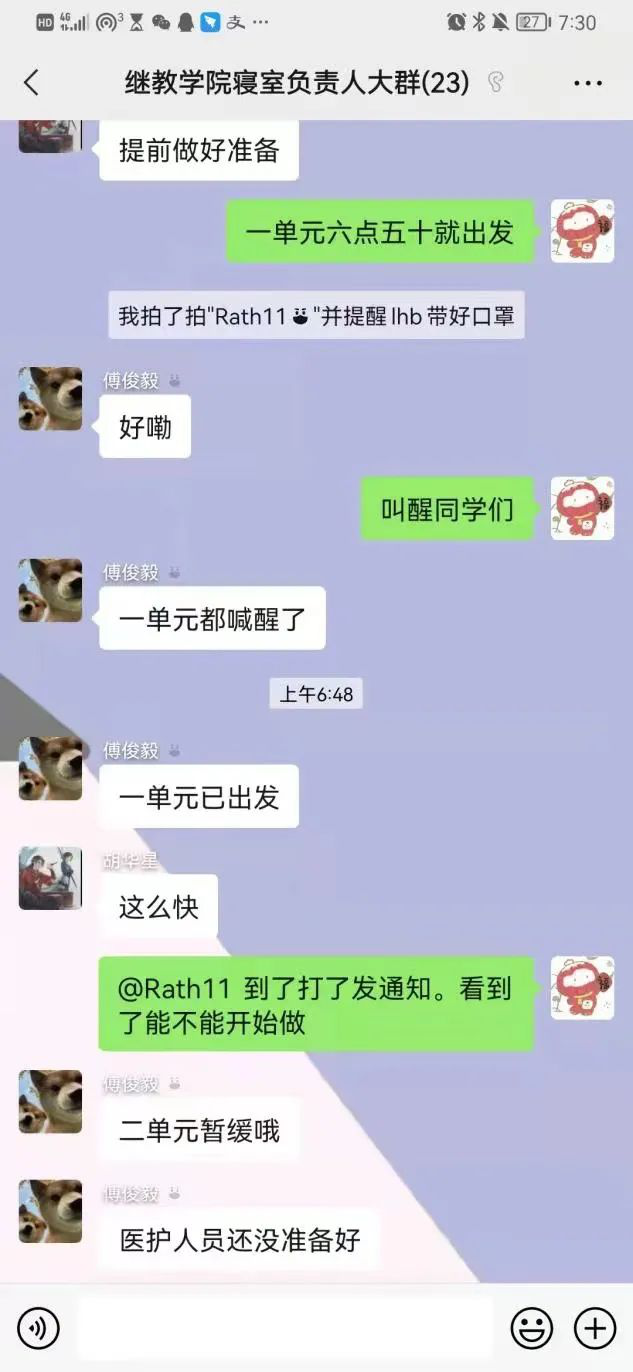 在抗疫志愿者的微信群里,以楼栋为单元设立负责人,明确志愿者职能,志愿者们各司其职,为此次抗疫后台建立起足量的“地基”!他们是平凡、是伟大、更是代表着学校、学院而“战”。