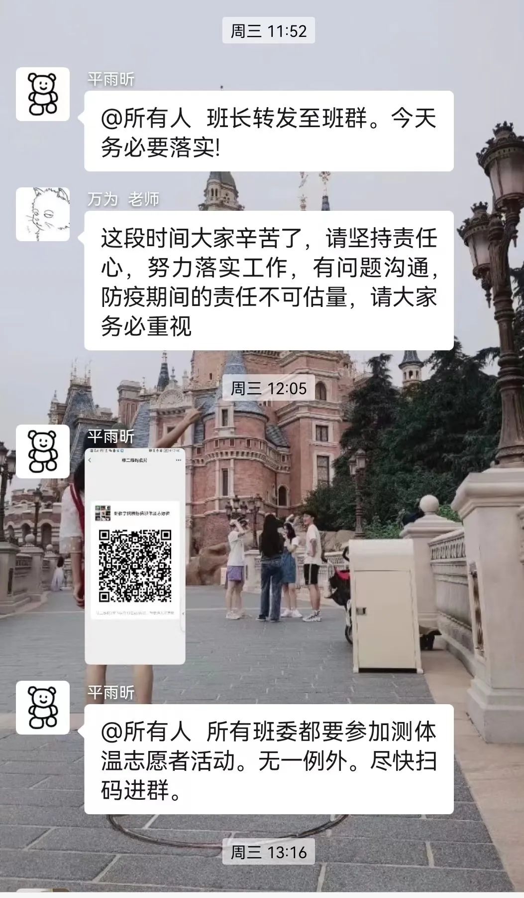 从4月4日起,我院严格按照校团委发布的防控要求,各栋楼层的志愿者从每天早上6:30到晚上10:30按时按点到岗,为广大师生提供测量体温服务。工作开展至今,团委书记万为老师带头坚持参加每日测温志愿者轮值,在防控工作中努力做志愿者的“好战友”,同学们的“安全员”、“宣传员”,带领志愿者队伍展示我院学子在提升服务群众过程中的责任担当和良好形象,为学校防控安全提供重要屏障。