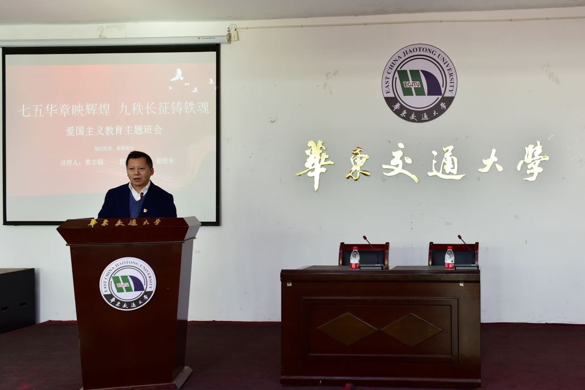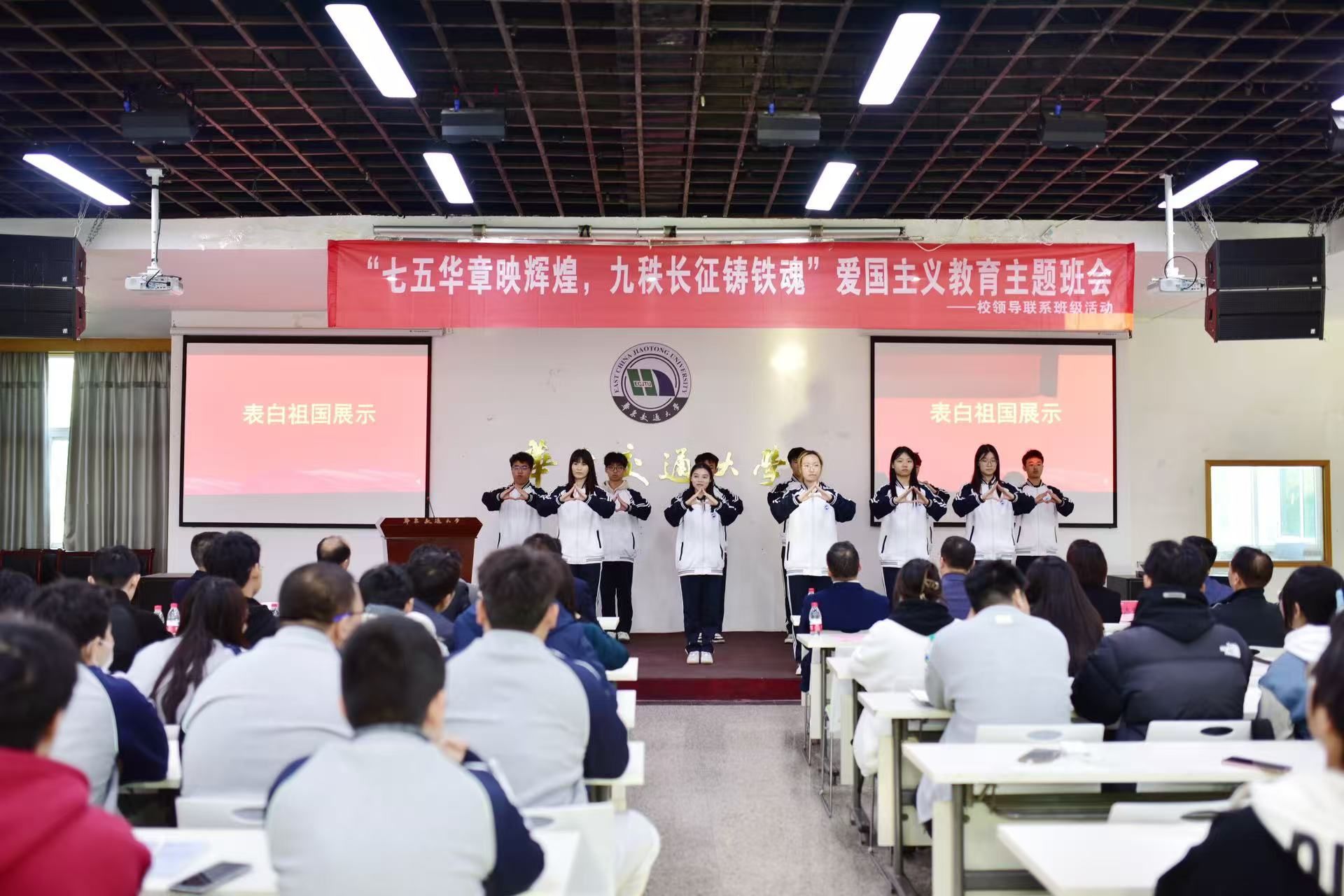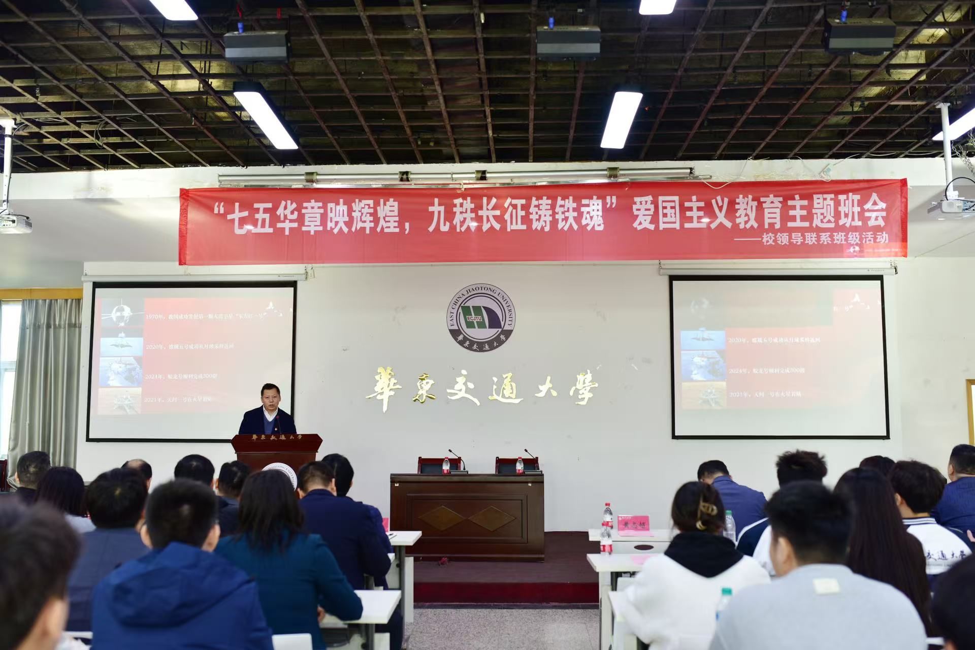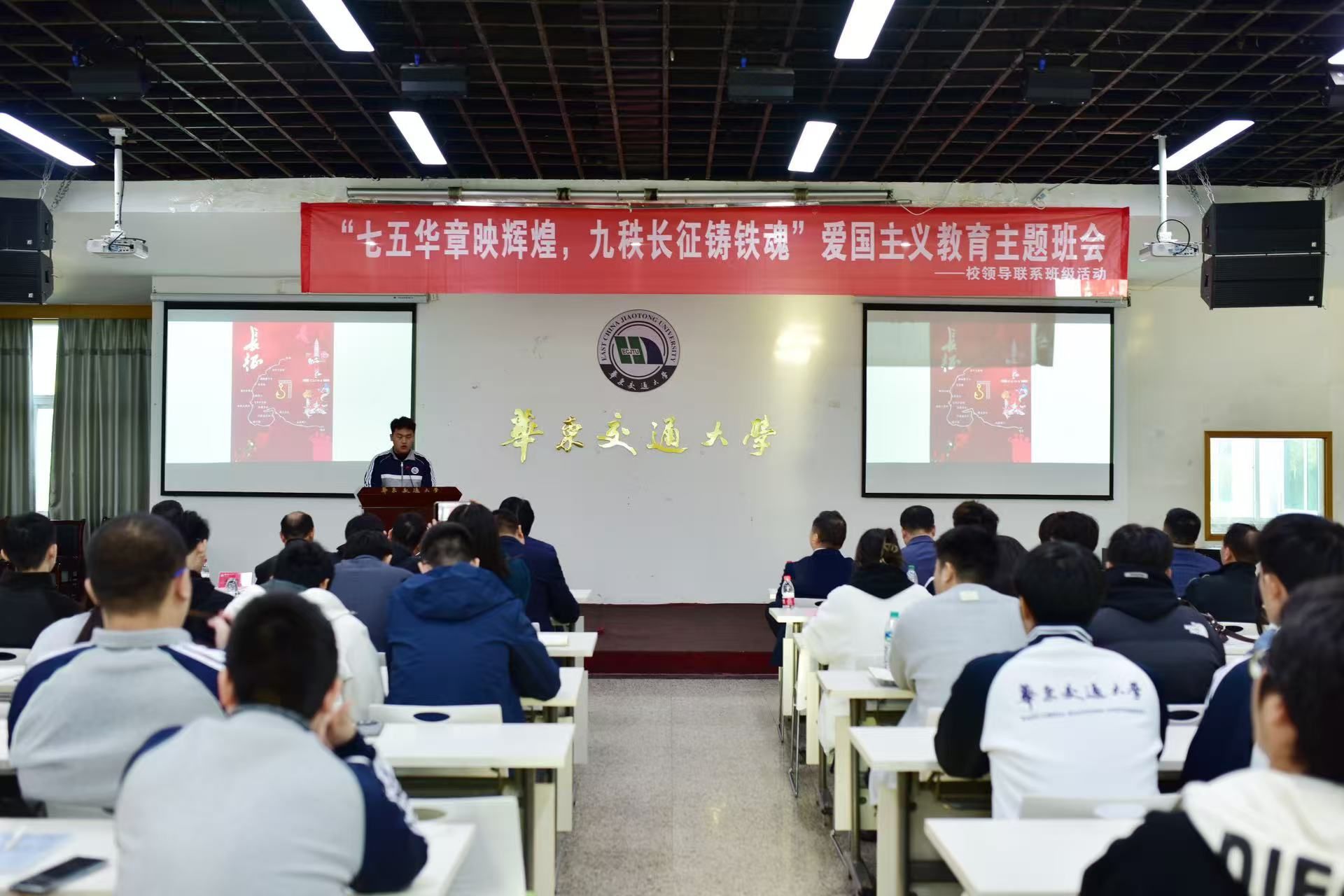 班会上,黄校长带领同学们共同回顾了新中国75年的辉煌历程和伟大的长征精神。黄校长通过生动的讲述和详实的史料给大家描绘了那段波澜壮阔的历史岁月。他指出同学们要传承和发扬这一宝贵精神财富,作为华交学子,要以“铁心铸忠诚、铁血报家国、铁肩担使命、铁手创大业”的铁人铁军风采,将爱国主义情怀和长征精神内化于心、外化于行,为实现中华民族的伟大复兴贡献自己的力量。