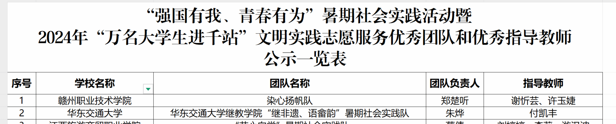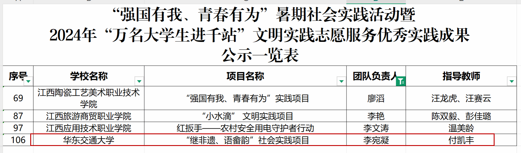 近日,江西省教育厅根据《关于组织开展“强国有我、青春有为”暑期社会实践活动暨2024年“万名大学生进千站”文明实践志愿服务行动的通知》工作安排。经高校推荐、省教育厅审核以及专家评审,拟确定“强国有我、青春有为”暑期社会实践活动暨2024年“万名大学生进千站”文明实践志愿服务行动多项奖项。我院荣获优秀实践成果1项,优秀团队和优秀指导教师1个。