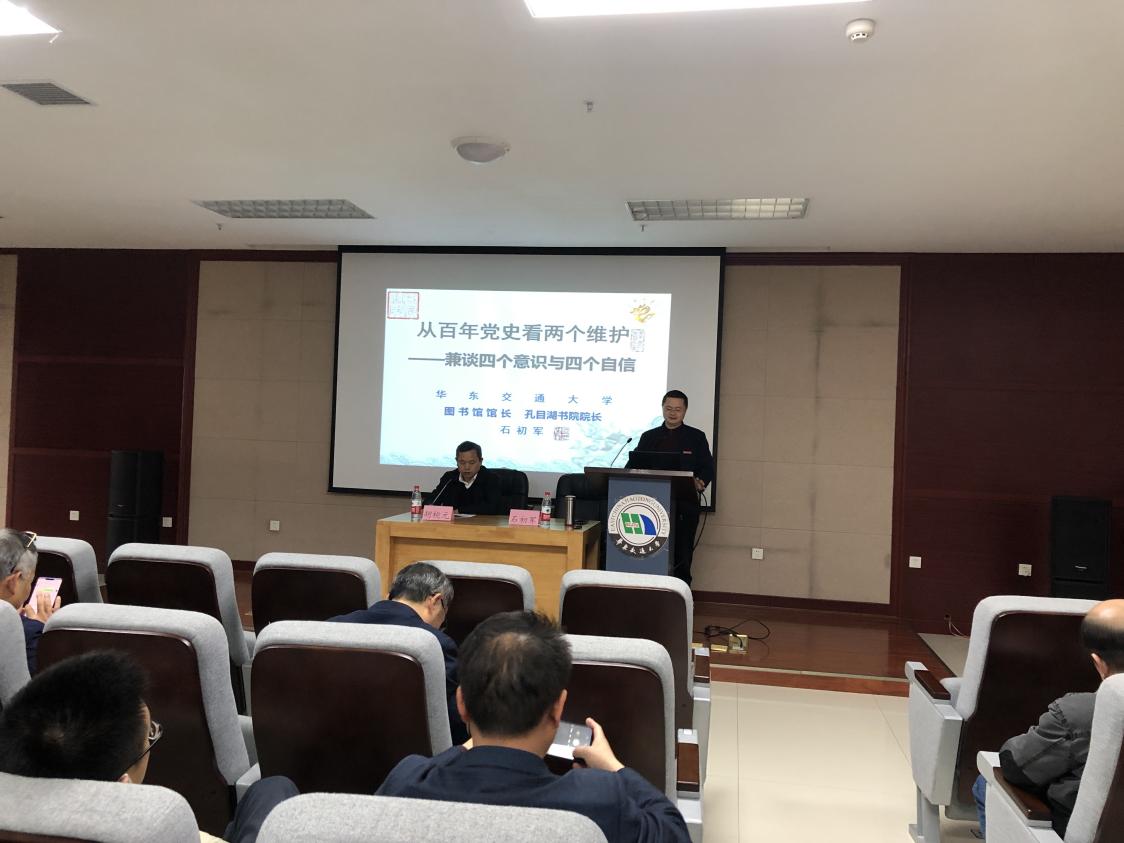 为推动我院党史教育走深走实、向纵深发展,激发全院师生更加自觉地从党的历史中汲取开拓前进的智慧和力量,不断提高政治能力、理论水平和工作执行力。4月15日,我院特邀学校党史宣讲团成员、图书馆馆长、孔目湖书院院长石初军老师,为全院师生党员及入党积极分子带来一堂题为“从百年党史看两个维护,兼谈四个意识与四个自信”的党史学习教育专题党课。院党委书记胡桃元主持。